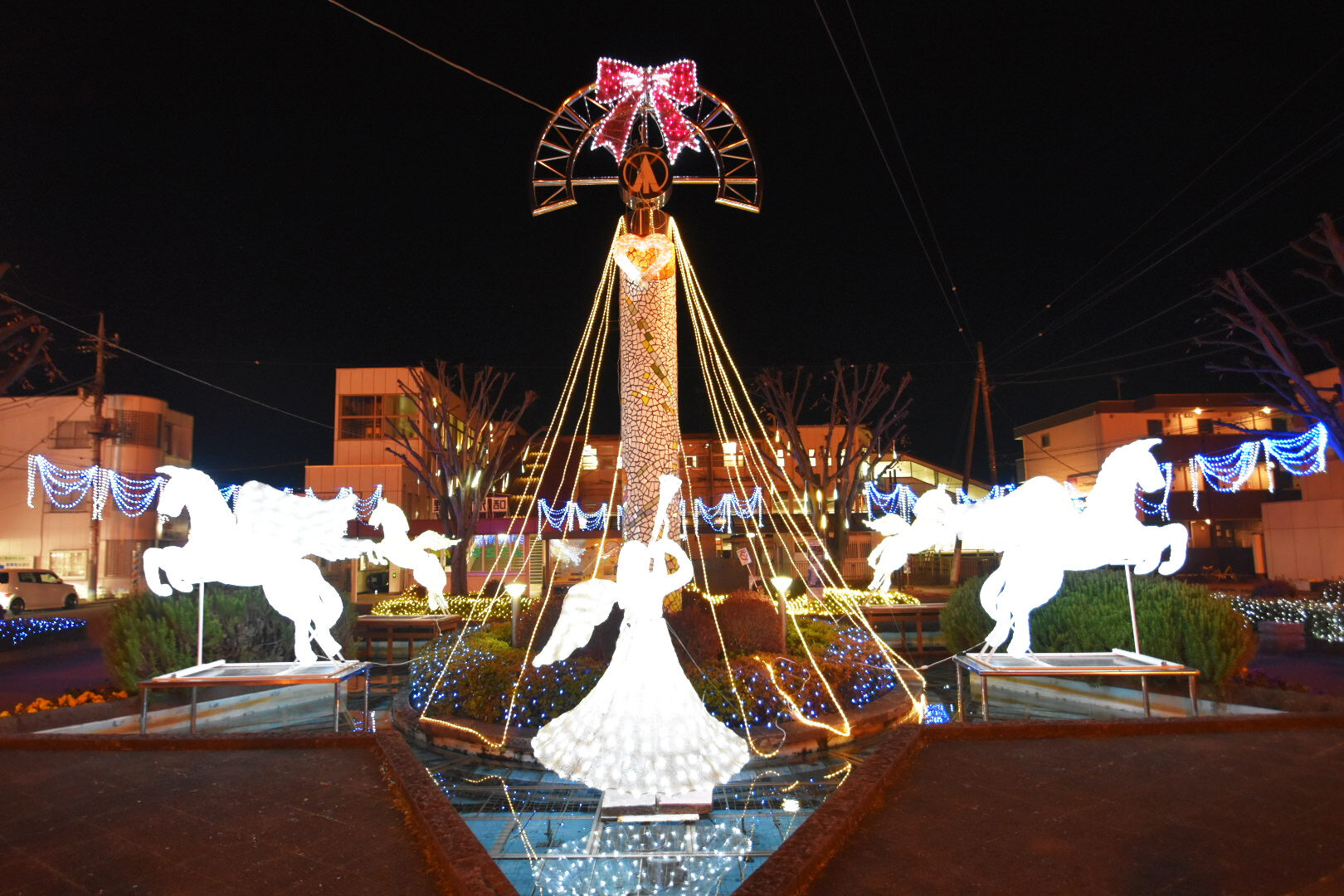 JR野木駅前東西ロータリーにエンジェル等多数のオブジェが登場し、約8万球のLEDライトが冬の駅前を華やかに彩る。